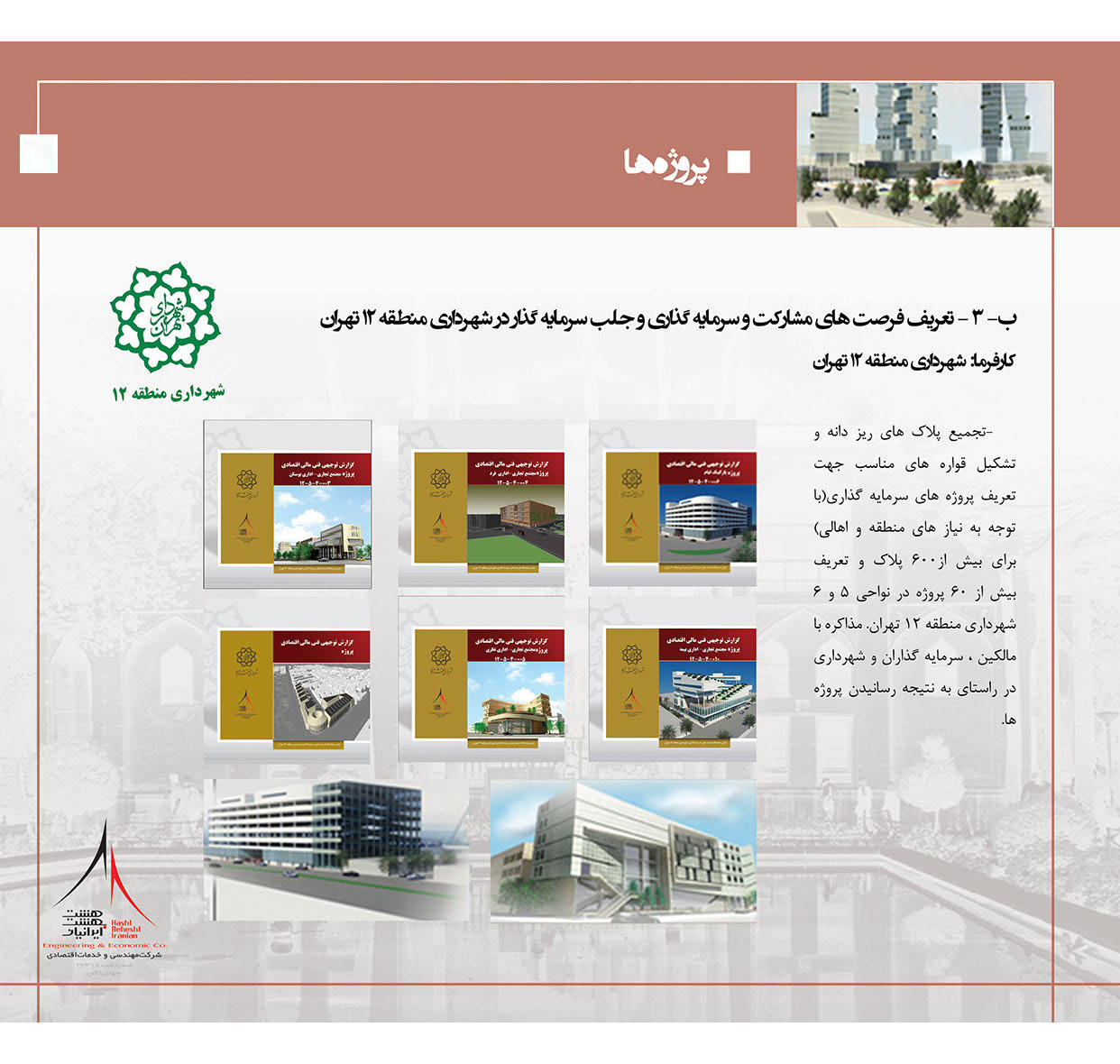 تجمع پلاک های ریز دانه و تشکیل قواره های مناسب جهت تعریف پروژه های سرمایه گذاری (با توجه به نیاز های منطقه و اهالی) برای بیش از 600 پلاک و تعریف بیش از 600 پروژه در نواحی 5 و 6 شهرداری منطقه دوازده تهران، مذاکره با مالکین، سرمایه گذاران و شهرداری در راستای به نتیجه رساندن پروژه ها.